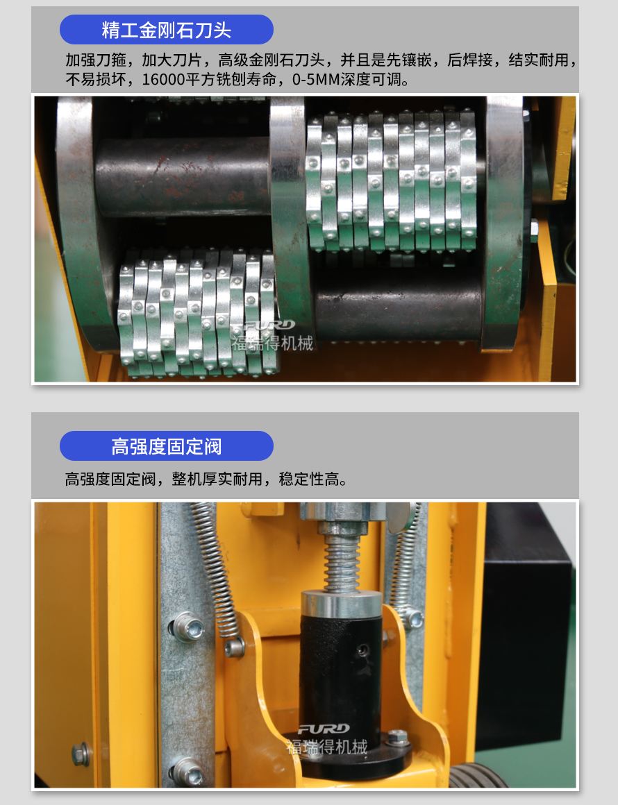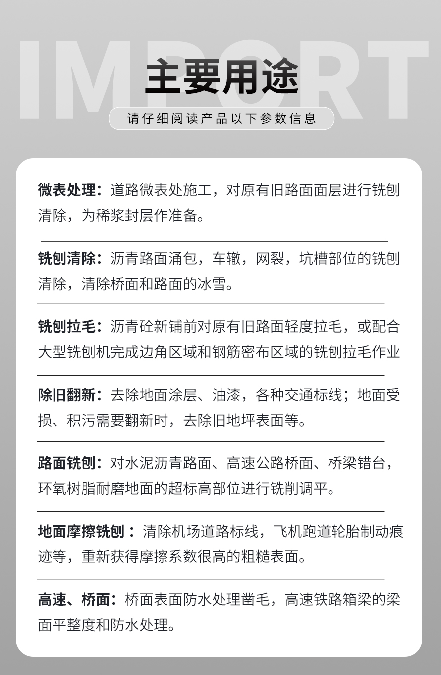 用于橋面鋪設(shè)瀝青或車(chē)間舊的混凝土地面重新攤鋪混凝土之前,清除水泥浮漿以及鏟平拉毛, 也用于清除建筑施工中的堅(jiān)硬灰渣。